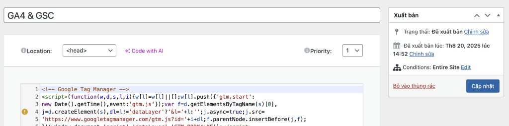 - Đặt tên cho code (ví dụ: “Google Analytics 4”)
