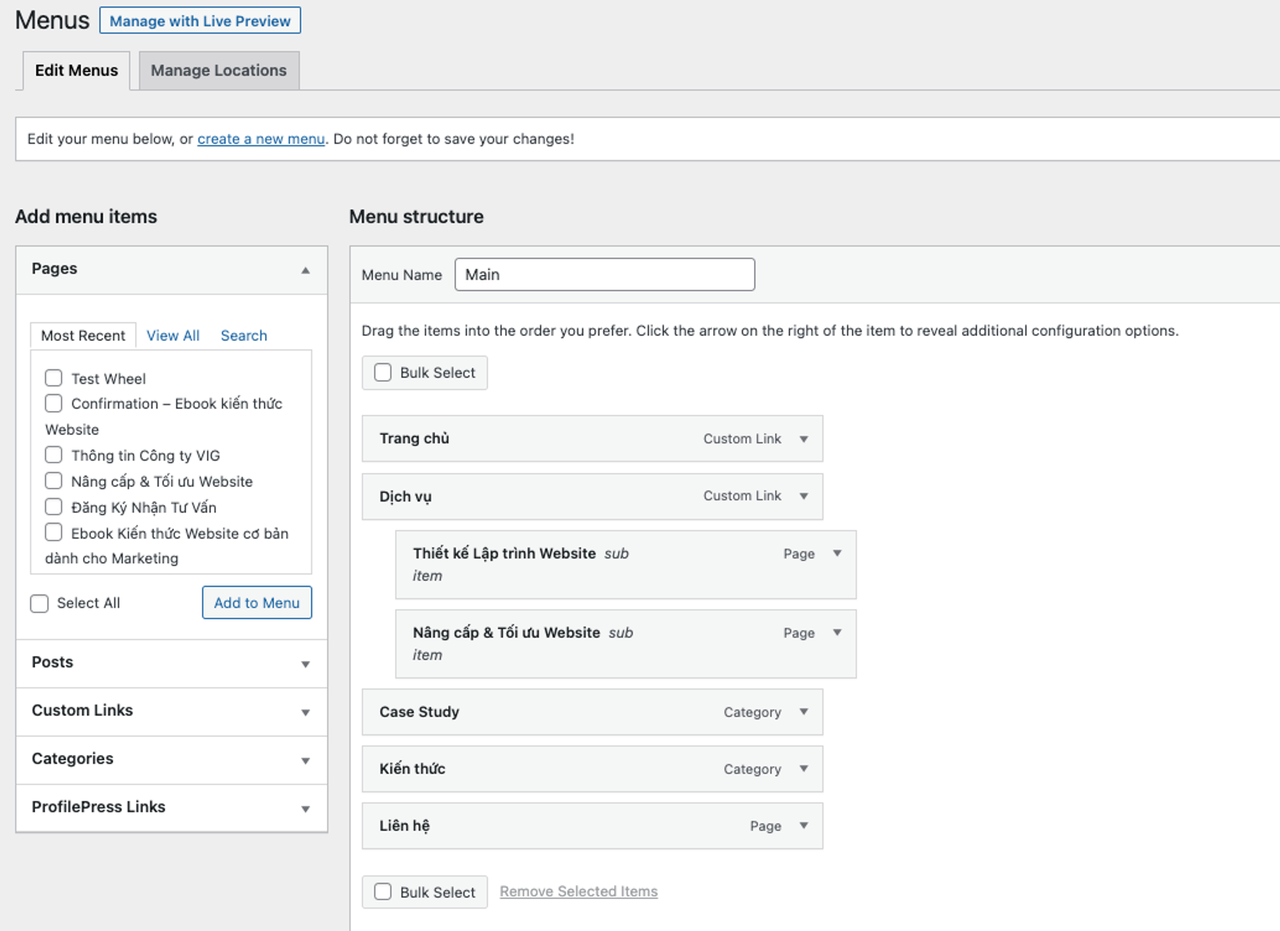 - Custom Links: các liên kết thủ công (điền bằng tay, không có trong cấu trúc của WordPress)