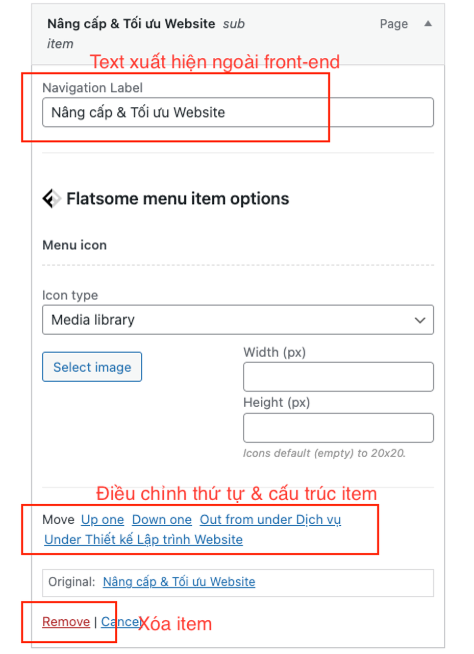 - Lên – Xuống: thay đổi thứ tự menu item.