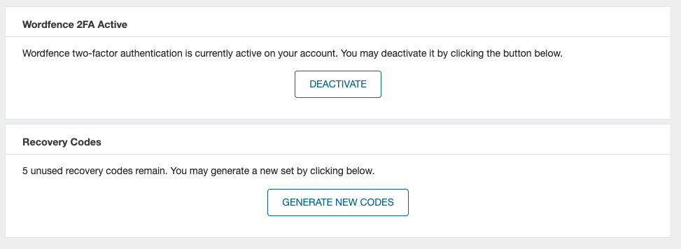 Sau khi active thành công bạn sẽ thấy trang như hình bên dưới. Trong trường hợp bạn đã sử dụng hết backup code, hoặc quên mất file, bạn có thể tạo lại bằng cách nhấn nút GENERATE NEW CODE.